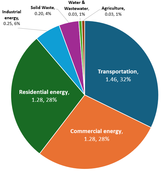 The Community-Wide GHG Inventory from 2014 reported total emissions of 4.516 MMT CO2E. Transportation caused 32% of emissions, Residential Energy 28%, Commercial Energy 28%, Industrial Energy 6%, Solid Waste 4%, Water & Wastewater 1%, and Agriculture 1%.