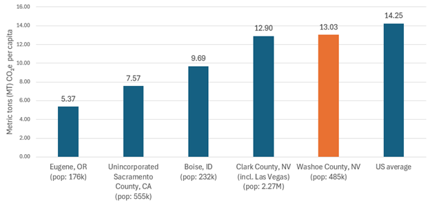 Total community wide greenhouse gas (GHG) emissions for Washoe County in 2021 were 6.32 million metric tons (MMT) carbon dioxide equivalent (CO₂e). 37% of emissions come from Transportation, 22% from Commercial Energy, 20% from Residential Energy, 15% from Industrial Energy, 2% from Solid Waste, 3% from Process & Fugitive Emissions, 1% from Water & Wastewater, and less than 1% from Agriculture, Forestry, and Other Land Use (AFOLU). This inventory includes emissions for City of Reno, City of Sparks, and Unincorporated Washoe County. It was calculated using ICLEI’s Clearpath software, and it uses 100-year global warming potentials (GWPs) from the Intergovernmental Panel on Climate Change (IPCC)’s 6th Assessment Report (AR).