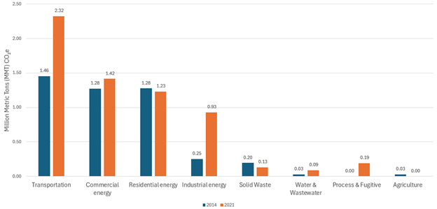 The community-wide inventory in 2014 measured 4.52 MMT CO2e. About half of the 1.80 MMT CO2e difference between 2014 and 2021 comes from direct emissions growth (0.84 MMT CO2e), and the rest comes from improvements in methodology (0.96 MMT CO2e). These methodology improvements include the addition of nonroad transportation (~0.50 MMT CO2e), the expansion of “point source” stationary fuels such as motor gasoline to Industrial Energy (0.30 MMT CO2e), and the addition of Fugitive Emissions (0.19 MMT CO2e).