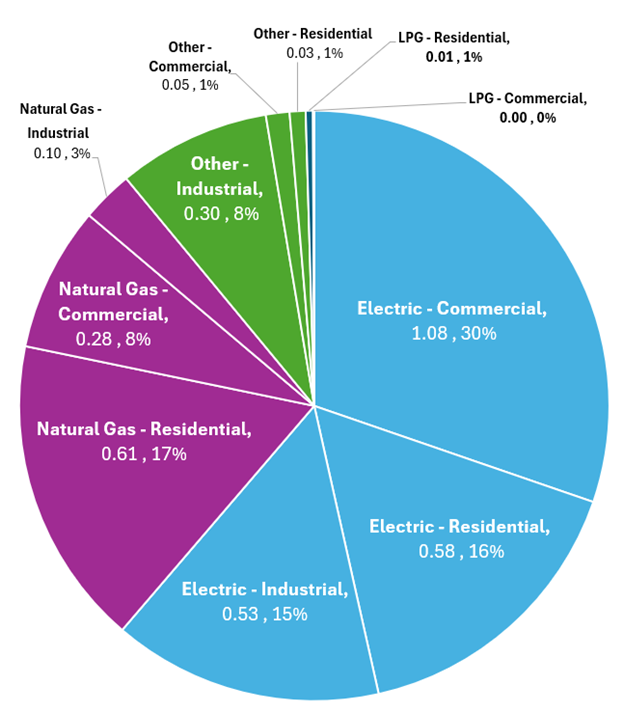 Sixty-one percent of the emissions from energy come from electric power, and 28% comes from natural gas, less than 1% comes from liquefied petroleum gas (LPG), and 11% comes from other fuel sources such as distillate fuel oil, hydrocarbon gas liquids (HGL), or wood.